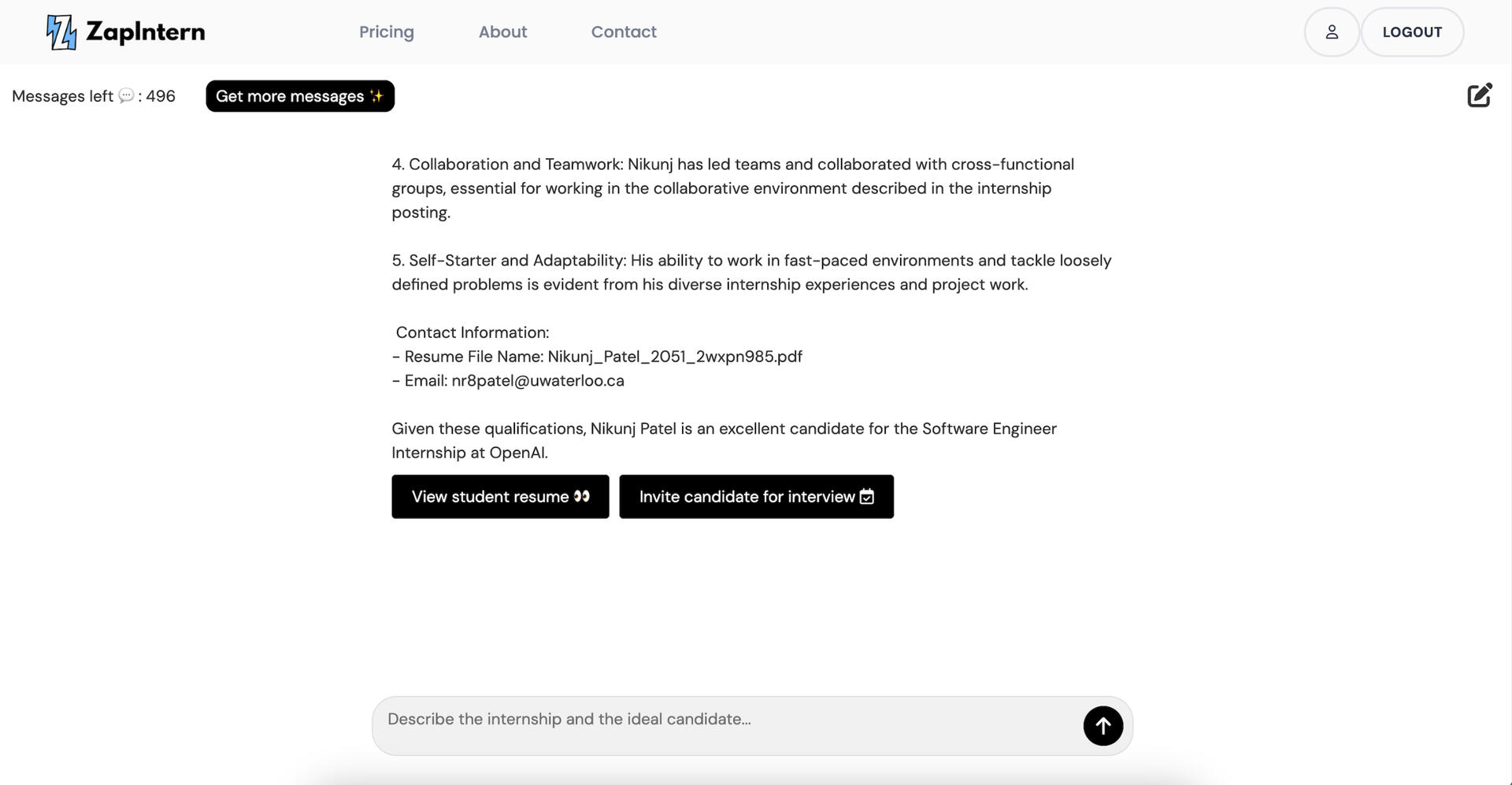 Simply describe your internship description and what candidate you are looking for and ZapAI will recommend you the best student for the role right away. You can then view their resume and invite them for an interview.
